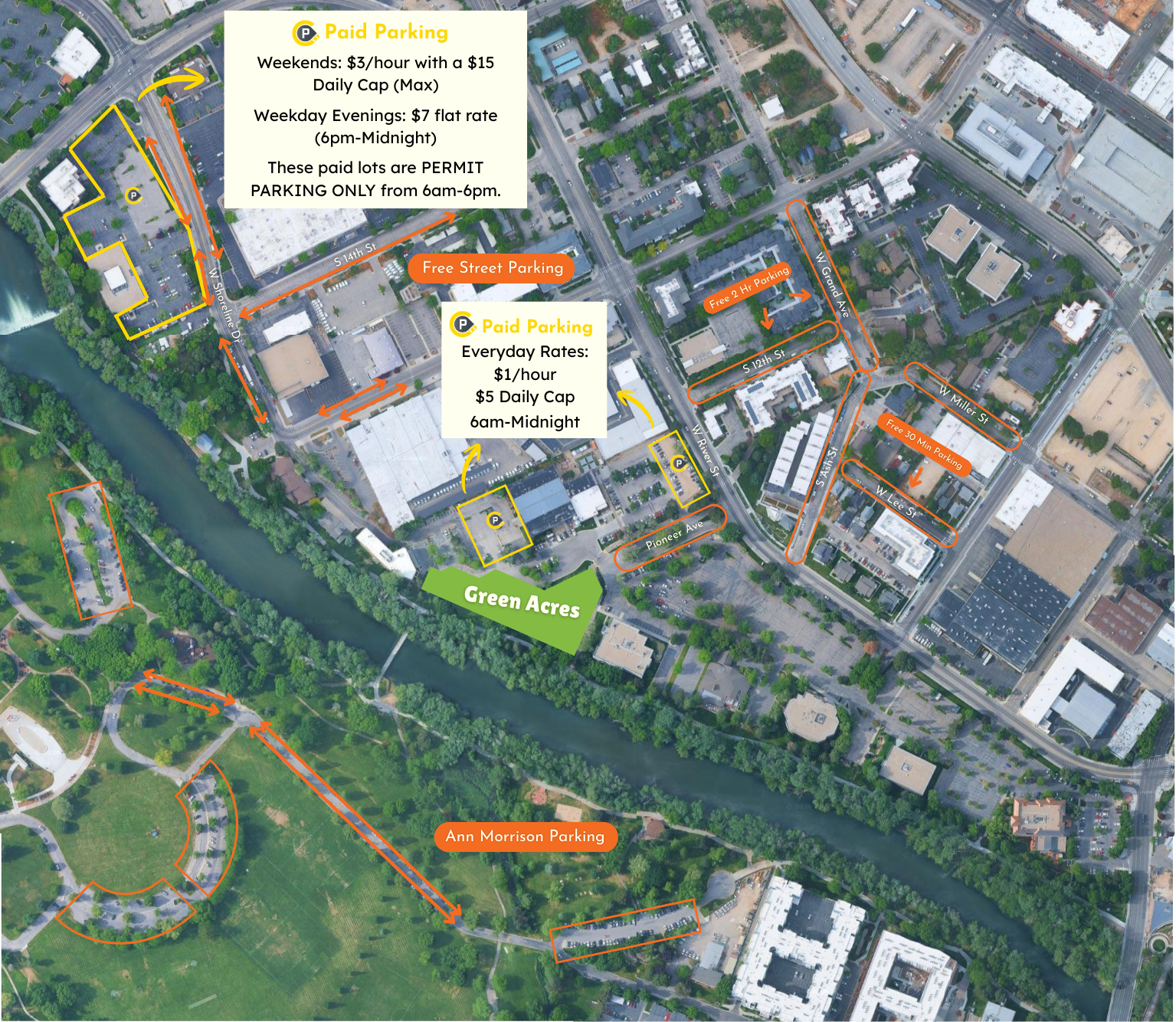 We are less than a 10 minute walk from Ann Morrison park. Ann Morrison has over 200 free parking spots. If you don’t mind a beautiful walk, park there and walk over to Green Acres.